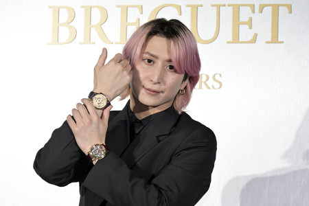 スイスの高級時計ブランド「ブレゲ」の250周年記念イベントにSnow Manの佐久間大介さんが出席。日頃から同ブランドの時計を愛用している佐久間さんは、1261万円の新作を着用して大興奮=23日、都内 【時事通信フォト】