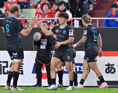 ラグビーのNTTリーグワン。昨季2位の東京ベイは同3位の神戸を33―28で振り切った。写真は後半、トライを決め、喜ぶ木田(中央)ら東京ベイの選手たち=13日、ノエビアスタジアム神戸 【時事通信社】